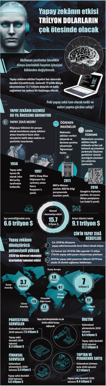 Yapay zekâ ile aynı nefeste anılan teknolojilerin başında akıllı otomobiller, fintek adı verilen yeni nesil ve kişiselleştirilmiş bankacılık sistemleri ve blokchain teknolojileri olarak anılan dijital para ve benzeri finansal hizmetler geliyor. Bu ürün ve hizmetler geleceğin dünyasına şekil verecek yeniliklerin başında gelirken bu teknolojilere hükmeden ülkelere de küresel rekabette büyük avantaj sağlayacak. PricewaterhouseCoopers’ın (PwC) araştırmasına göre Çin yapay zekânın dünya ekonomisine 2030’ya gelindiğinde sağlayacağı 15.7 trilyon dolarlık ek büyüklükten en çok faydalanan ülke olacak. Bunun nedeni ise doğrudan nüfus ile ilgili. ABD ve AB’li şirketler yapay zekâ temelli gelirlerini nüfusun yavaş arttığı gelişmiş ülkeler üzerinden elde ederken Çin bu alandaki gelirini gelişmiş ve gelişmekte olan Asya’nın neredeyse tamamından elde edecek. Bu durum oluşacak 15.7 trilyon dolarlık yapay zekâ pastasının yüzde 44.6 ile 7 trilyon dolarlık bölümünün Çin’e gitmesi anlamına gelecek.