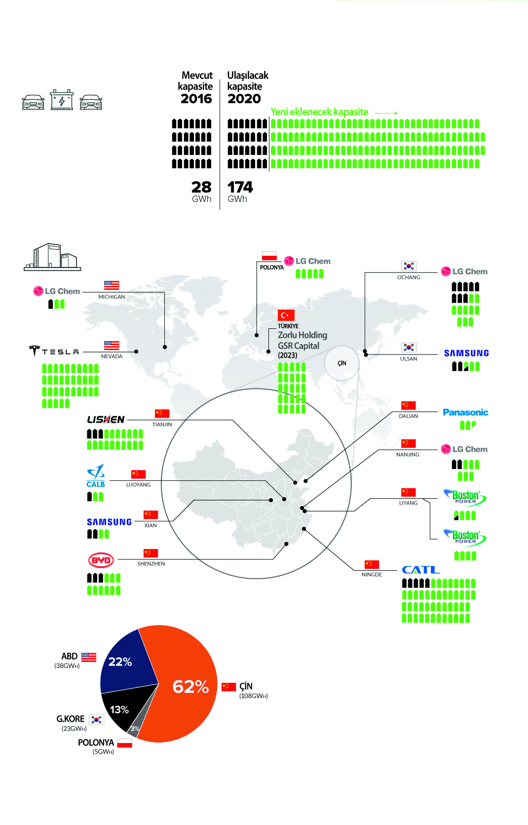 Küresel lityum iyon pil üretim kapasitesi henüz 30 Gigawatt saat (GWh) seviyesinde. 2020’de bu rakam 174 GWh’e çıkacak. 2023’te 25 GWh’lik kapasiteye ulaşacak olan Türkiye’de dünyanın en büyük beş pil üreticisinden biri olacak. Doğru yönde atılan bu adım kararlı AR-GE çalışmalarıyla desteklenir ve fonlanırsa Türkiye gelecek için anahtar rol üstlenecek bir teknolojide büyük oyunculardan biri olur